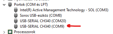 USB-SERIAL CH340. Ha több ilyen van, nézd meg, melyik tűnik el, ha kihúzod és bedugod az beállítandót eszközt.