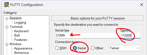 PuTTY (vagy más terminálprogram) segítségével indítsd el a kommunikációt az eszközzel. Baudrate: